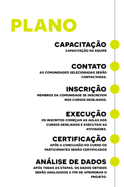 Através de colaboradores locais, que serão devidamente treinados, os cursos serão disponibilizados gradativamente para matrícula e posterior execução. Ao concluir os cursos escolhidos, o aluno será devidamente certificado.
